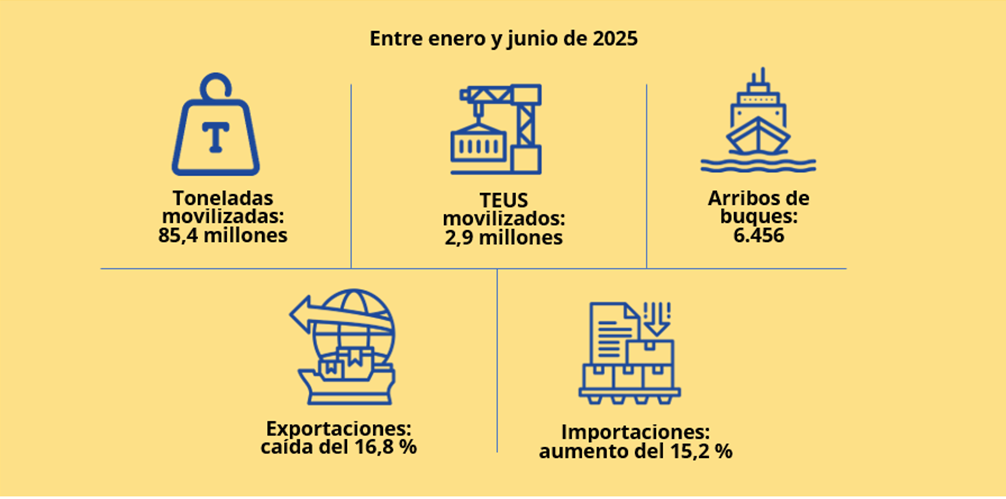 Como se ha dicho, para el primer semestre de 2025, el tráfico portuario totalizó 85,4 millones de toneladas movilizadas, cifra que representa una variación negativa de 6,1% frente al mismo periodo de 2024, cuando se movilizaron más de 91 millones de toneladas. En comparación con 2023, cuando se movilizaron cerca de 86,8 millones, el comportamiento se mantiene en niveles similares.