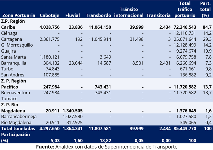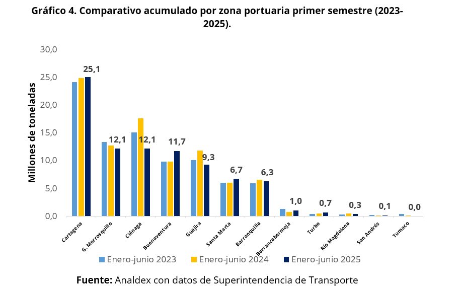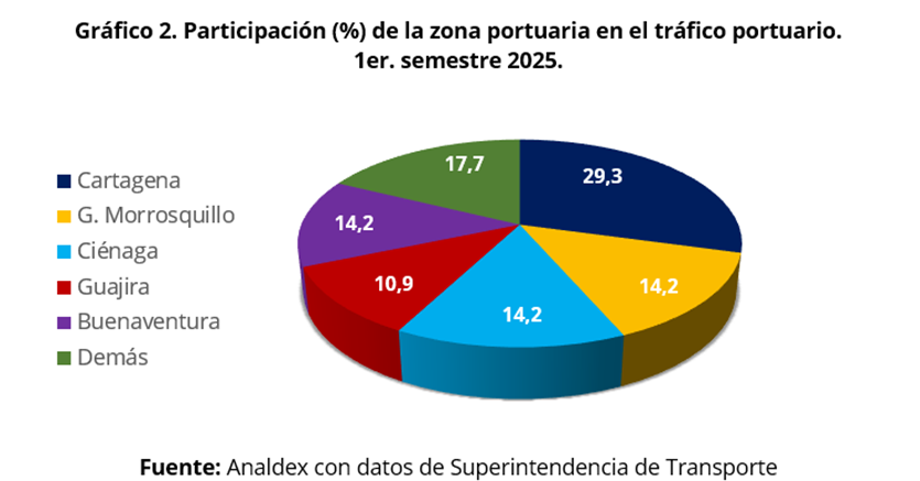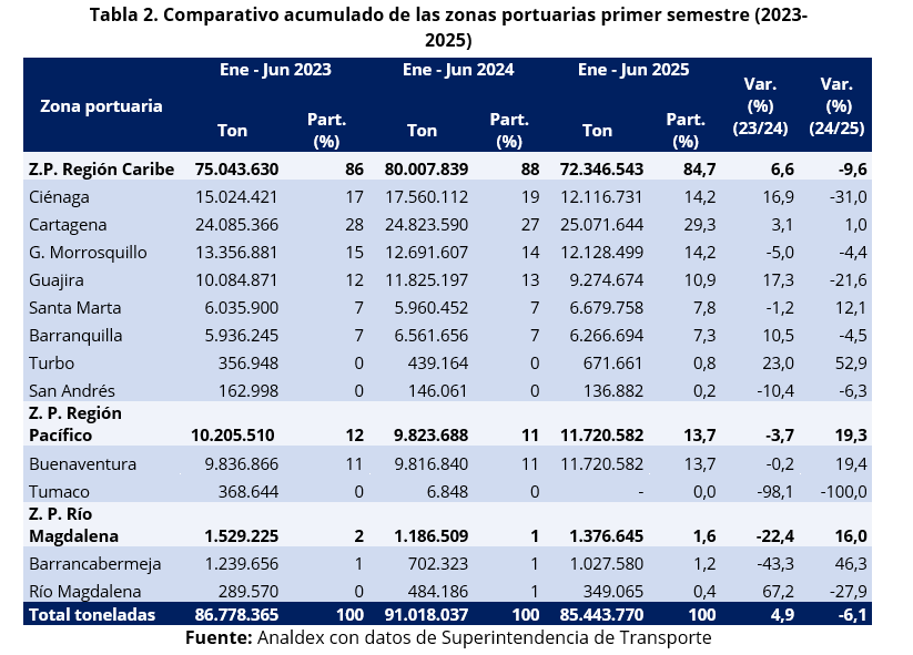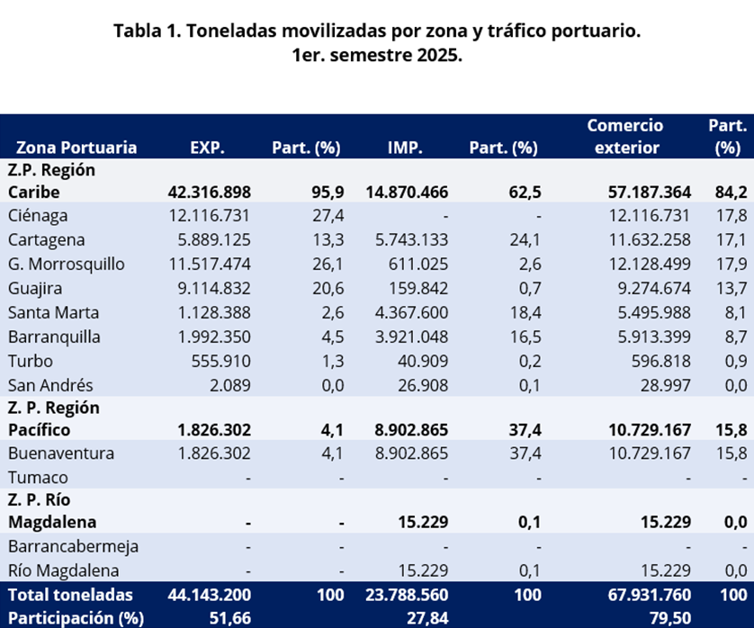 El tráfico portuario para el primer semestre de 2025 movilizó un total de 85,4 millones de toneladas. Este movimiento estuvo liderado por la zona portuaria de la región Caribe con un total de 72,3 millones de toneladas, cifra que representa un 84,7% de participación sobre el total del tráfico nacional. Las exportaciones de los puertos de esta zona constituyen un 95,9%, del total de exportaciones nacionales, mientras las importaciones alcanzan un 62,5%.