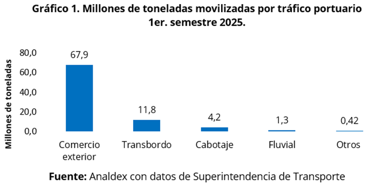 Las toneladas movilizadas por tráfico portuario durante el primer semestre de 2025 se caracterizaron principalmente por ser operaciones destinadas al comercio exterior, las cuales representaron el 79,5% del tráfico total con 67,9 millones de toneladas.