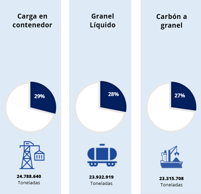 En los primeros seis meses de 2025, el movimiento portuario se concentró principalmente en contenedores, granel líquido y carbón mientras que los graneles sólidos diferentes al carbón y la carga general tuvieron una menor participación, como se muestra en el siguiente gráfico.