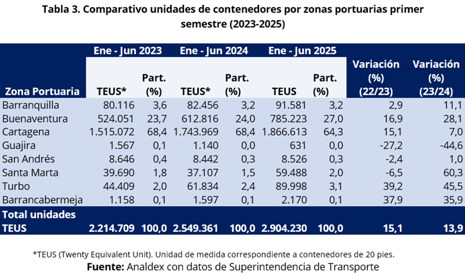 La Zona Portuaria de Cartagena sigue siendo líder con 1,87 millones de TEUS, equivalentes al 64,3% del total nacional. Le sigue la Zona Portuaria de Buenaventura con 785 mil TEUS que representan un 27,0% del total.