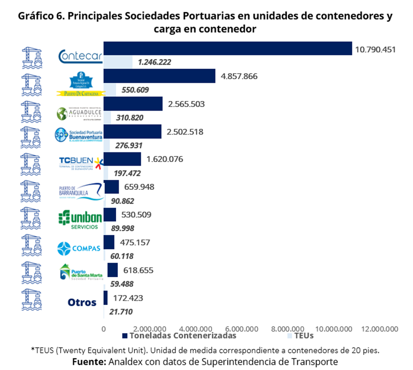 La Terminal de Contenedores de Cartagena S.A. lideró el movimiento de contenedores con 1,2 millones de TEUS (43,5%), seguida por la Sociedad Portuaria Regional de Cartagena que movilizó 550 mil TEUS (19,2%).