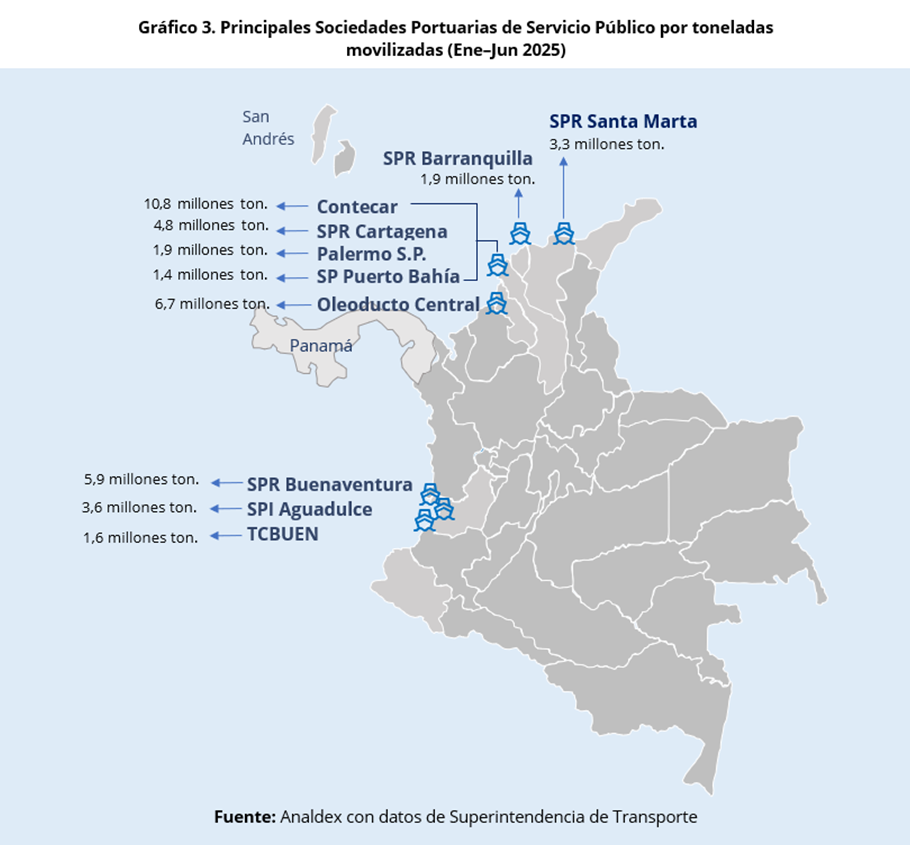 Para el primer semestre de 2025 las Sociedades Portuarias que más toneladas movilizaron fueron la Terminal de Contenedores de Cartagena S.A. (Contecar) con una participación del 20,4% sobre el total nacional movilizado por Sociedades de Servicio Público, seguido por el Oleoducto Central S.A. y la Sociedad Portuaria Regional de Buenaventura con una participación del 12,7% y 11,2% respectivamente.