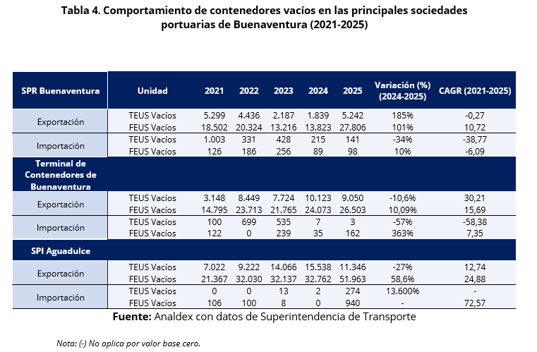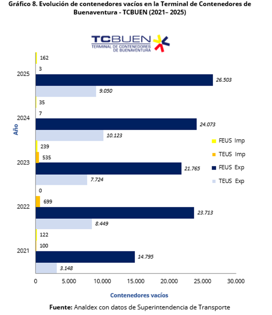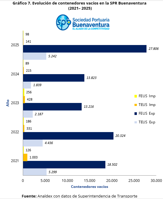 Los datos del movimiento de contenedores vacíos por Buenaventura, entre 2021 y 2025 muestran un crecimiento significativo en las exportaciones de este tipo de unidades, especialmente en TCBUEN y SPI Aguadulce.