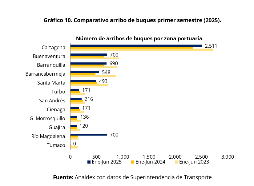 A lo largo del primer semestre de 2025, se registraron 6.456 arribos de buques a los puertos del país, esto significa un aumento del 14% frente al mismo periodo del año anterior. La zona portuaria que más buques recibió fue Cartagena con 2.511 arribos y una participación del 38,9% sobre el total nacional. Le sigue Barranquilla con 690 arribos (10,7%) y Barrancabermeja con 548 arribos (8,5%).