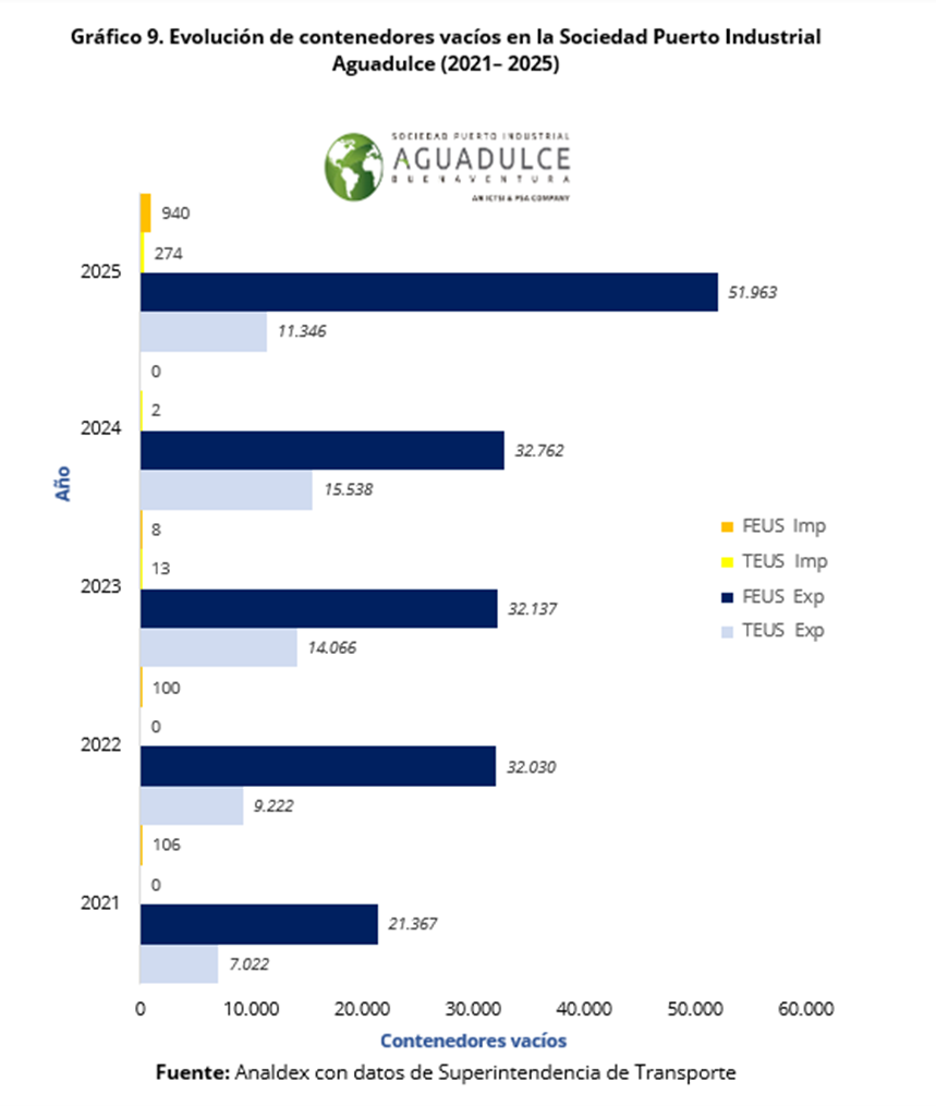 SPI Aguadulce también mostró un aumento en la tasa de crecimiento anual de exportaciones de vacíos. Los TEUS crecieron a una tasa del 12,7% pasando de 7.022 unidades en 2021 a 11.346 en 2025. Los FEUS también registraron un crecimiento con una tasa del 24,8% durante el mismo periodo.