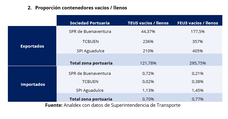 La mayor proporción de vacíos respecto a llenos exportados se presenta en TCBUEN y SPI Aguadulce principalmente, allí las proporciones superan el 200% en TEUS y el 350% en FEUS.