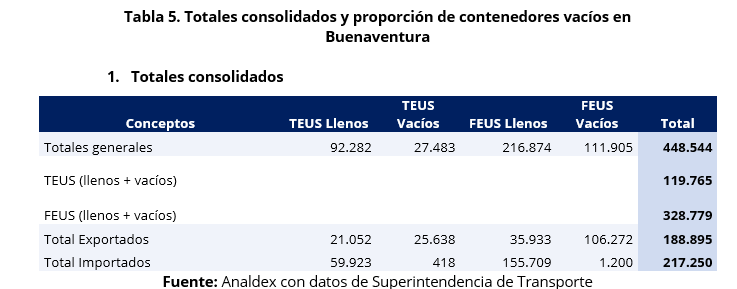 En contraste, en la Sociedad Portuaria Regional de Buenaventura esa relación es un poco menor, los TEUS vacíos representan el 44,3% de los TEUS llenos exportados, mientras que los FEUS vacíos representan el 177,5% de los llenos.