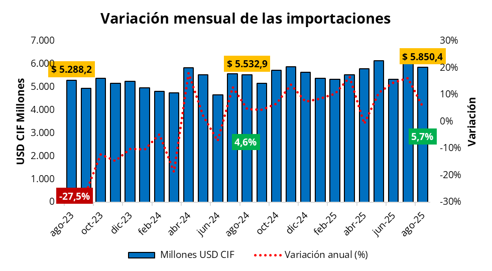 En lo acumulado de enero – agosto de 2025, las compras externas sumaron USD CIF $45.849,3 millones, presentando un incremento de 10,0% frente al mismo periodo de 2024 (USD CIF $41.685,9 millones). El volumen importado alcanzó 29,7 millones de toneladas, registrando un crecimiento de 10,5%.