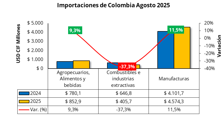Por grupos de productos, las importaciones de manufacturas participaron con 78,2% del valor CIF total de las importaciones, seguido por productos agropecuarios, alimentos y bebidas con 14,6%, combustible e industrias extractivas participaron con 6,9%, y otros sectores con 0,3%. El aumento del valor de las importaciones colombianas en agosto fue explicado principalmente por el crecimiento en vehículos de carretera (62,2%), otro equipo de transporte (658,0%) y máquinas de oficina y máquinas de procesamiento automático de datos (25,8%) que en conjunto contribuyeron con 8,2 puntos porcentuales positivos a la variación total.