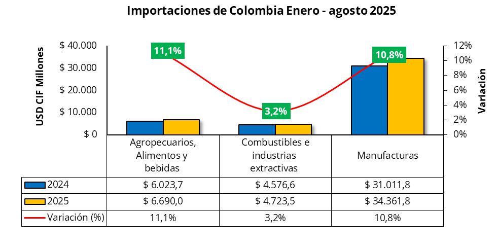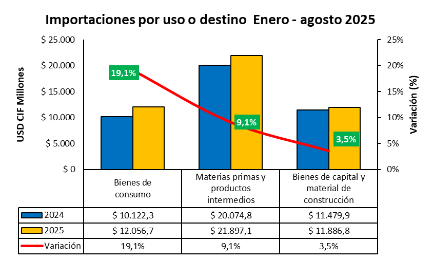Analizando las importaciones por uso o destino económico, en el acumulado de enero – agosto de 2025, las compras de materias primas y productos intermedios alcanzaron la cifra de USD CIF $21.897,1 millones, reportando un aumento de 9,1% respecto al mismo periodo del año 2024. De este grupo los productos que contribuyeron en la mayor variación positiva fueron la compra de productos químicos y farmacéuticos (9,5%), productos agropecuarios no alimenticios (21,0%) y productos alimenticios (13,9%).