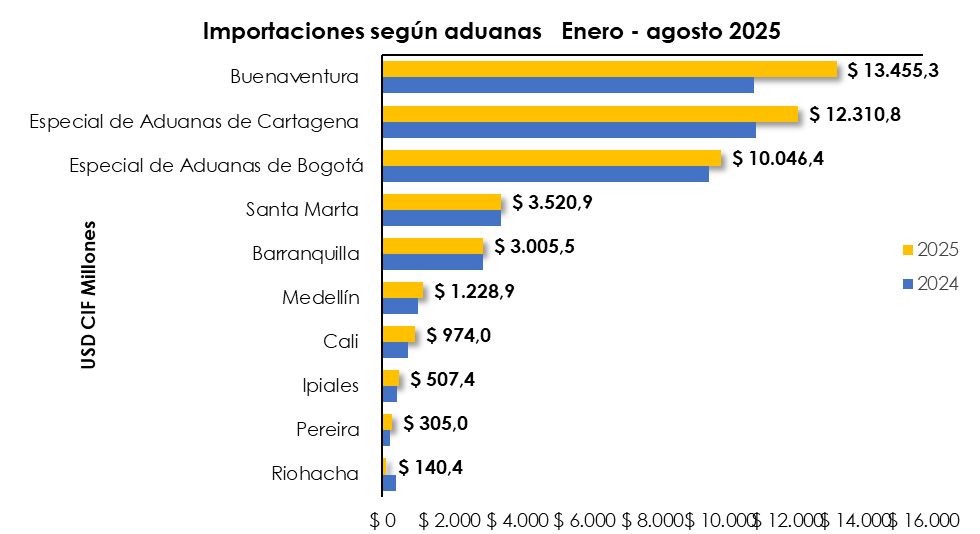 En lo corrido del año, Buenaventura fue la principal aduana de ingreso de las importaciones, al representar el 29,3% del total. Se evidenció un crecimiento de las compras al exterior por esta aduana de 22,2%, al pasar de USD CIF $11.014,9 millones a USD CIF $13.455,3 millones.