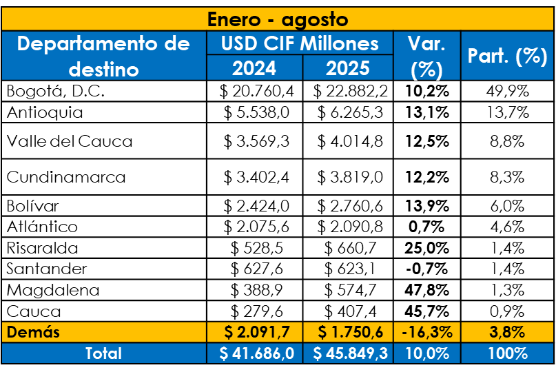 En segundo lugar, se encuentra Antioquia con una participación de 13,7%. En el periodo de referencia se realizaron importaciones por un valor de USD CIF $6.265,3 millones, presentando una variación positiva de 13,1%. Valle del Cauca se posicionó en tercer lugar con una participación de 8,8%. Durante el acumulado enero – agosto, este departamento realizó importaciones por un valor de USD CIF $4.014,8 millones, presentando un crecimiento de 12,5% en comparación con el mismo periodo del año 2024 en el cual se realizaron compras al exterior por un valor de USD CIF $3.569,3 millones.