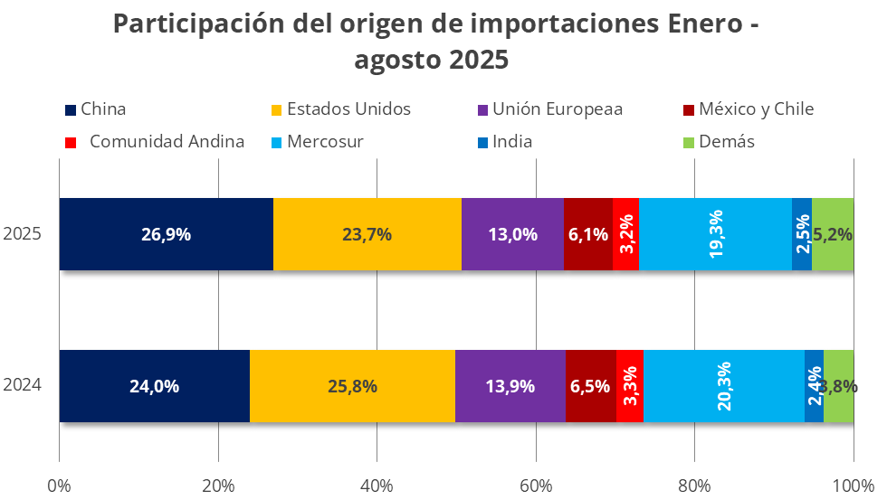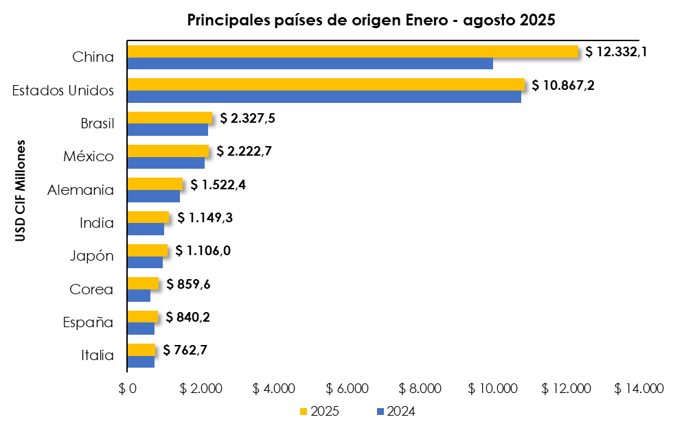 Al analizar los países de origen de los productos importados, para el acumulado del año, China sigue manteniendo el primer lugar con una participación de 26,9% confirmando superar a Estados Unidos en este año. Para este mismo periodo se registraron compras a este país por un valor de USD CIF $12.332,1 millones y una variación positiva de 23,2% respecto al periodo de referencia en el año 2024.