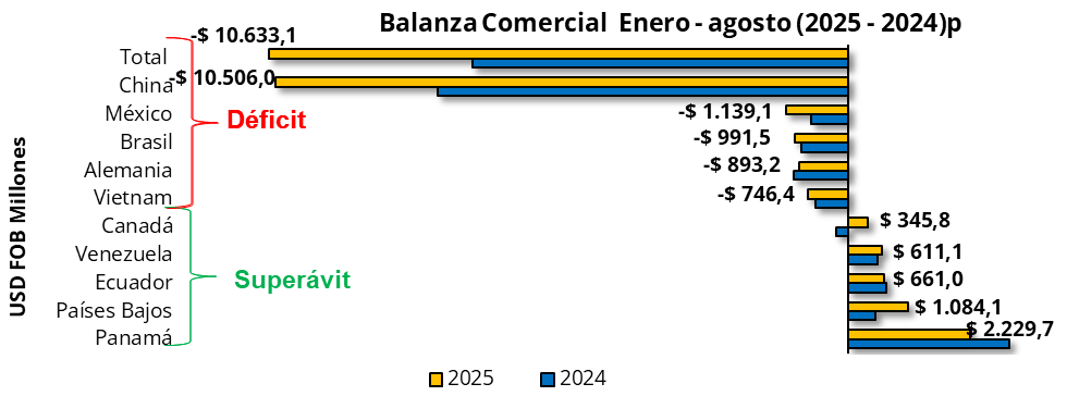 Los países que generaron un mayor déficit comercial fueron: China con USD FOB $10.506,0 millones, seguido por la México con USD FOB $1.139,1 millones y Brasil con USD FOB $991,5 millones. Por el contrario, los países con los cuales se mantiene mayor superávit comercial son: Panamá con USD FOB $2.229,7 millones, seguido de Países Bajos con USD FOB $1.084,1 millones, y en tercer lugar Ecuador con USD FOB $661,0 millones.