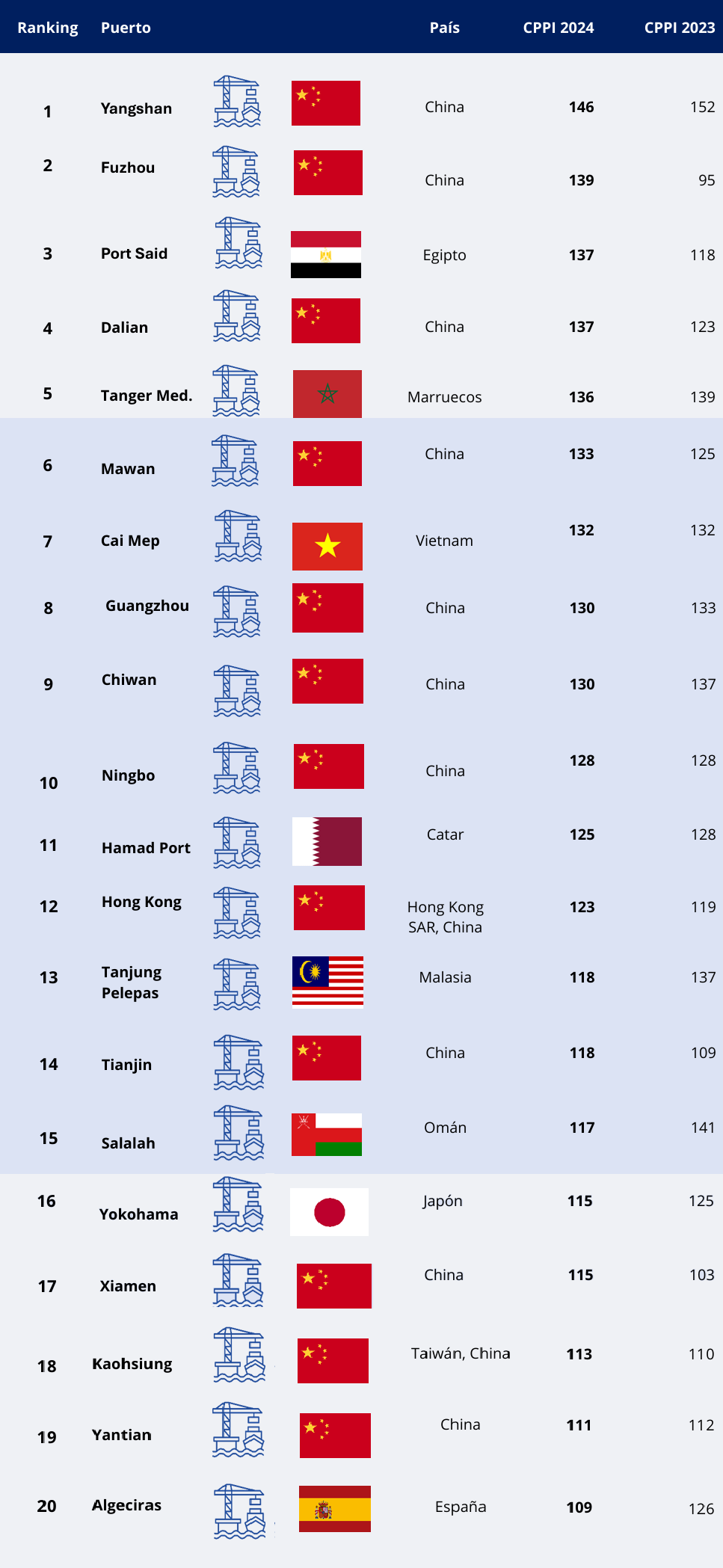 Con respecto al rendimiento individual, elpuerto de Yangshan, Shanghái en China continúa en el primer lugar con una puntuación de 146, consolidándose como el líder mundial en eficiencia.