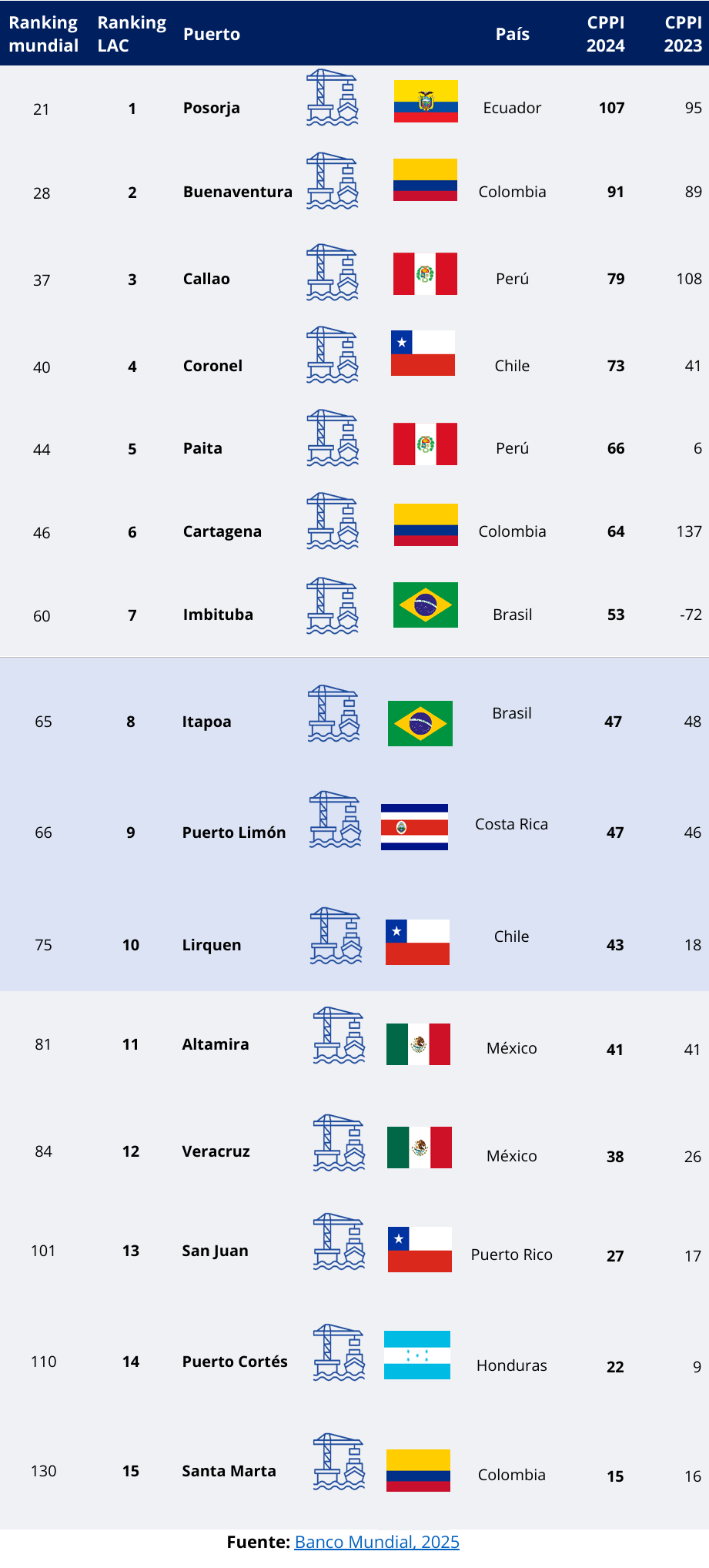 Los resultados para América Latina y el Caribe evidencian el liderazgo regional de Posorja en Ecuador, que con un CPPI de 107 encabeza la clasificación de la zona y se ubica en el puesto 21 a nivel global. Este resultado muestra una mejora significativa frente al año anterior cuando obtuvo una calificación de 95 y se situó en la posición 37 del ranking mundial.