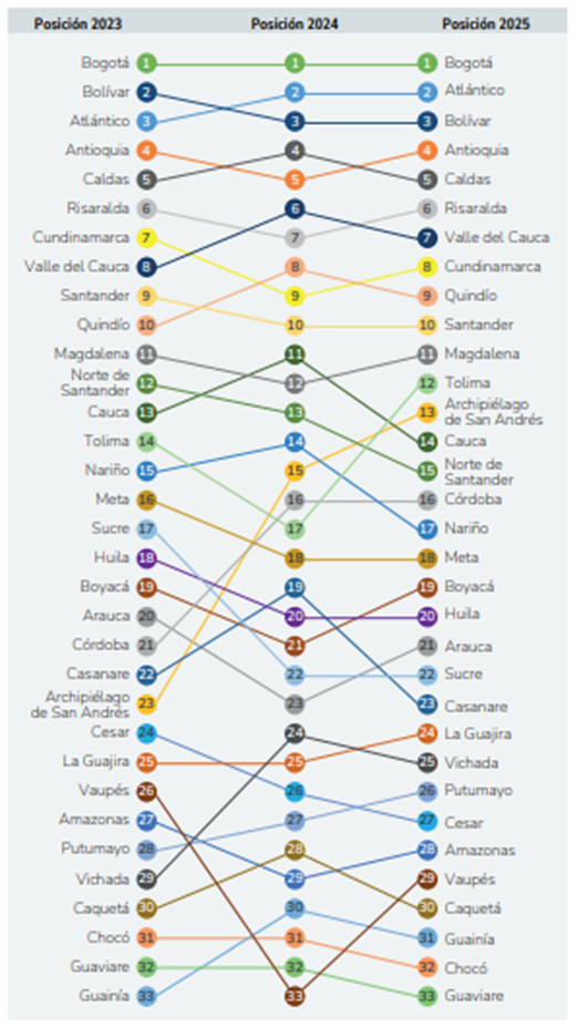 El resto del top 5 está conformado siempre por los mismos cuatro departamentos, aunque con cambios internos de posición. En 2023 el orden era Antioquia, Bolívar, Caldas y Atlántico; en 2025 la foto final es Bogotá, Atlántico, Bolívar, Antioquia y Caldas. Esto implica que Atlántico es el gran ganador relativo del período, al escalar desde la quinta casilla hasta el segundo lugar, apoyado en un fuerte desempeño en las variables de gestión. Bolívar se mantiene de forma consistente en el podio, mientras que Antioquia desciende del segundo al cuarto puesto y Caldas cede ligeramente, aunque conserva su presencia en la élite del índice.