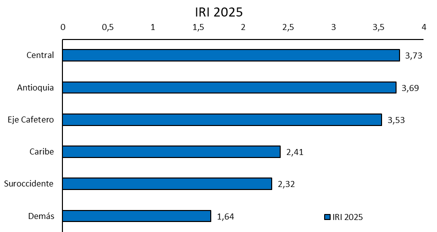 En un segundo escalón se ubican Caribe y Suroccidente, con IRI de 2,41 y 2,32 respectivamente. Estas regiones muestran avances frente al grupo rezagado, pero todavía mantienen una brecha cercana a 1,3 puntos respecto a la región Central, lo que indica que, aunque existe infraestructura portuaria, base exportadora y presencia de instrumentos nacionales, la articulación institucional y la profundidad de la internacionalización aún son más acotadas. Finalmente, la región “Demás” registra un IRI de 1,64, muy por debajo del resto. Este resultado refleja la persistencia de rezagos estructurales en buena parte de la periferia amazónica, llanera y pacífica, donde la escala empresarial es menor, la oferta institucional llega con más dificultad y los canales de internacionalización son más incipientes.