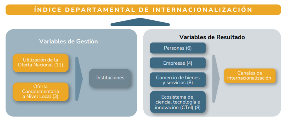 La medición parte de la metodología oficial del Índice Departamental de Internacionalización (IDI) elaborada por el MinCIT. El IDI se estructura en dos grandes componentes: variables de gestión e indicadores de resultado. El bloque de gestión captura el grado de utilización de la oferta nacional de instrumentos de internacionalización (12 variables asociadas con Plan Vallejo, zonas francas, OEA, instrumentos de CTeI, entre otros) y la existencia de oferta complementaria a nivel local (3 variables que recogen agencias de promoción, mesas de internacionalización y servicios territoriales especializados).