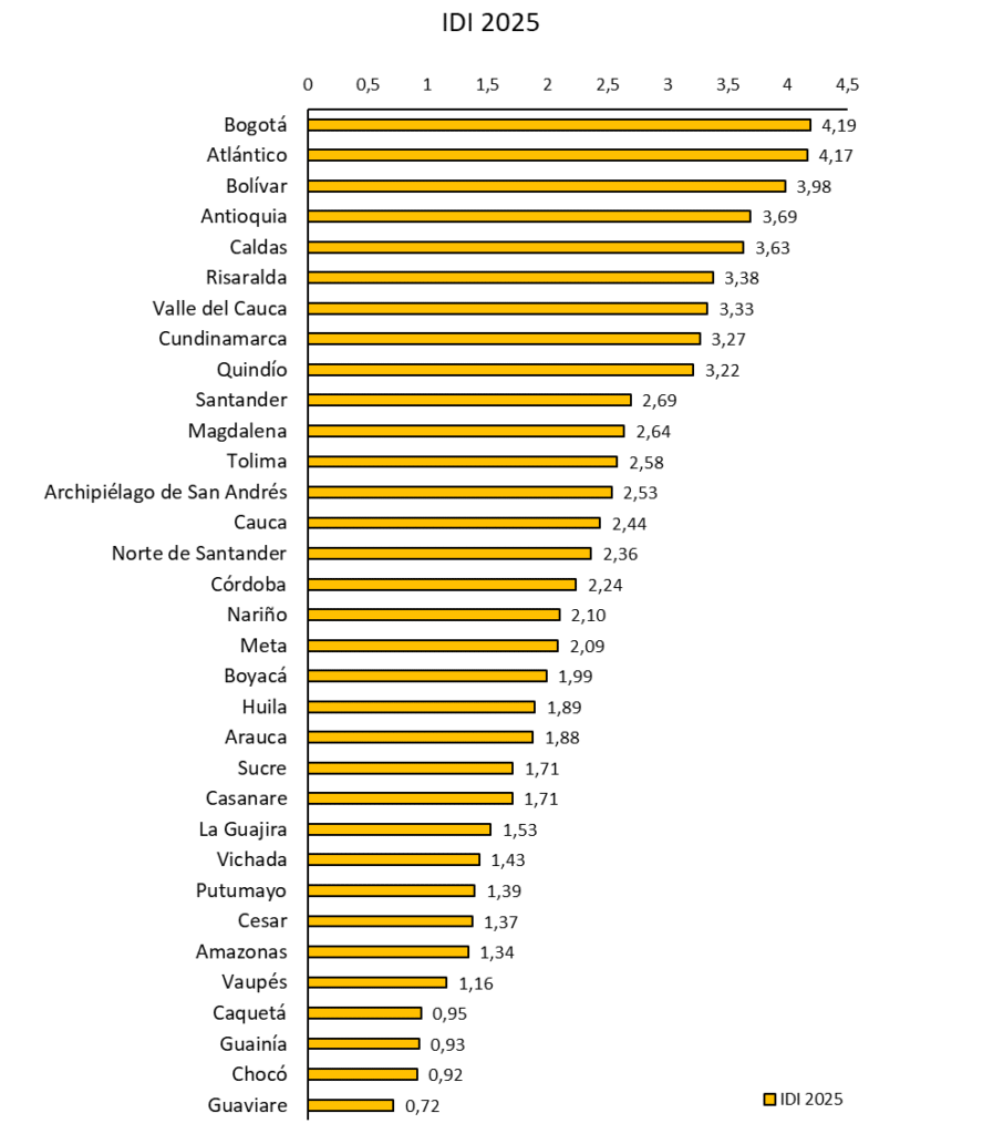 Los resultados del IDI 2025 confirman una fuerte heterogeneidad entre departamentos. El puntaje oscila entre 4,19 y 0,72 puntos en una escala de 0 a 10, lo que refleja diferencias importantes en capacidades y resultados de internacionalización.