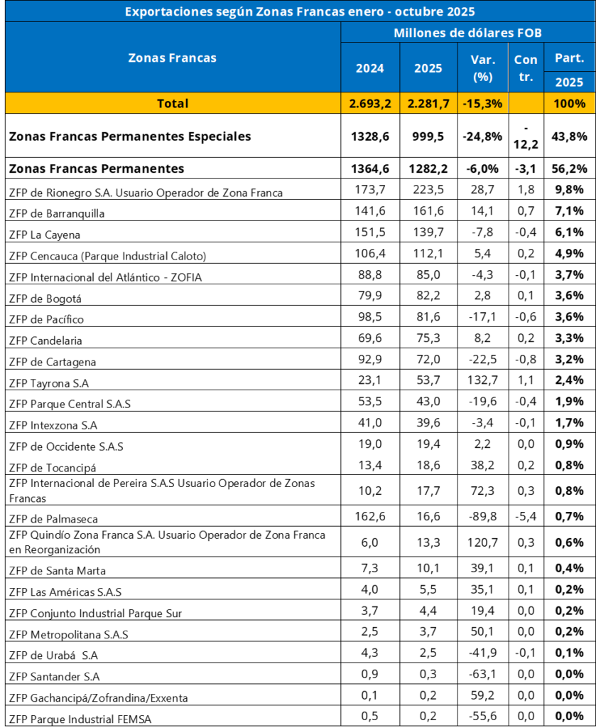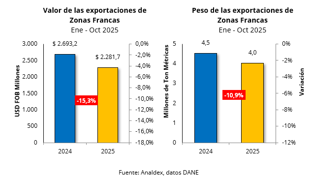 En lo corrido de 2025, se registró una disminución de 15,3% en el envío de mercancías al exterior desde zonas francas, pasando de USD FOB $2.693,2 millones en 2024 a USD FOB $2.281,7 millones en 2025. Durante el año 2025, el volumen total de exportaciones se redujo en un 10,9% respecto al mismo periodo de 2024. En 2024 se exportaron 4,5 millones de toneladas métricas, mientras que en 2025 la cifra descendió a 4 millones de toneladas métricas.