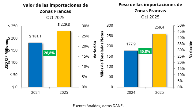 En octubre de 2025, las importaciones de las zonas francas evidenciaron una variación positiva de 26,8%, al pasar de USD CIF $181,1 millones en octubre del 2024 a USD CIF $229,7 millones en el mismo mes de 2025. Por otro lado, el volumen de importaciones aumentó en un 45,8%, al pasar de 178 mil toneladas métricas en octubre de 2024 a 259 mil toneladas métricas en octubre de 2025.