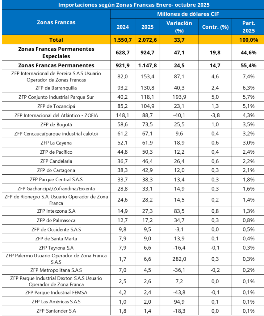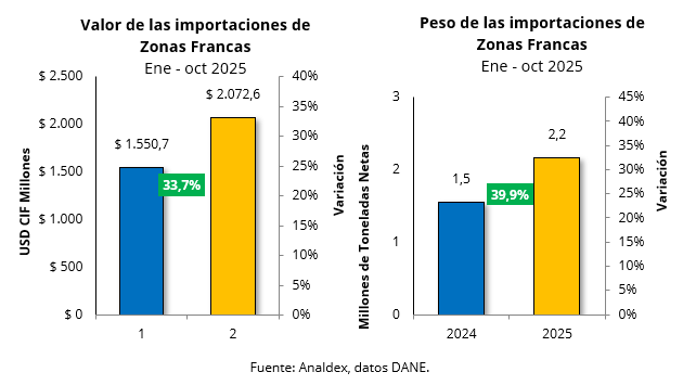 En lo corrido del año las importaciones de las zonas francas alcanzaron un valor de USD CIF $2.072,5 millones, lo que representó una variación positiva de 33,7% respecto a lo registrado en el mismo periodo de 2024, en el cual se presentaron compras externas por un valor de USD CIF $1.550,6 millones.