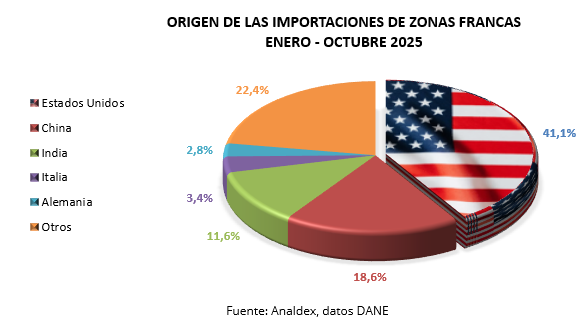 En 2025 al mes de octubre, Estados Unidos fue el principal origen de las importaciones de las zonas francas, con un valor de USD CIF $852,3 millones, presentando un crecimiento de 51,5% en comparación con 2024. En segundo lugar, se encuentra China, con un valor importado de USD CIF $385,4 millones y un crecimiento de 32,5%. Otro de los principales orígenes de compras al exterior es India, que registra un crecimiento de 96,9%, y cuyas importaciones alcanzan la cifra de USD CIF $240,4 millones.