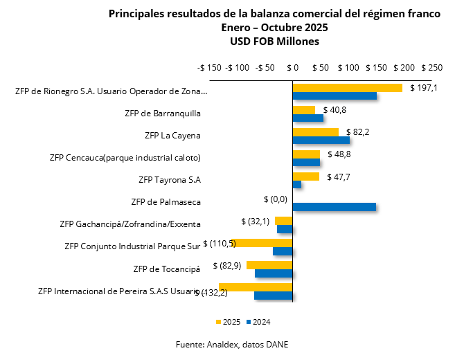 Por zonas francas, la ZFP Rionegro con USD FOB $197,1 millones presentó el mayor superávit comercial, seguido de ZFP de Barranquilla, ZFP La Cayena, ZFP Cencauca y ZFP Tayrona S.A.. Por otro lado, la ZFP Internacional de Pereira, la ZFP de Tocancipá, la ZFP Conjunto Industrial Parque Sur, la ZFP Gachancipá (ZOFRANDINA) y la ZFP de Palmaseca son las que registraron mayor déficit.
