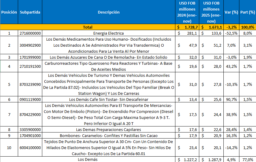 Con corte a ene–nov, la canasta exportadora de Colombia hacia Ecuador muestra una composición altamente diversificada, donde conviven bienes minero-energéticos con manufacturas y agroindustria. En 2025, el valor total exportado alcanzó USD FOB $1.673,1 millones, frente a USD FOB $1.728,7 millones en 2024 (-3,2%), y el principal factor detrás de la contracción fue el componente energético, la energía eléctrica pasó de USD FOB $281,1 millones a USD FOB $133,6 millones, con una caída de -52,5%, aunque se mantuvo como el principal renglón individual con 8,0% de participación.