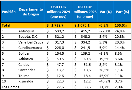 En el resto del ranking, el comportamiento fue mixto. Bolívar cayó -9,9% (hasta USD FOB $139,2 millones, 8,3%), mientras Atlántico se destacó por un crecimiento de 19,5% (hasta USD FOB $60,3 millones, 3,6%). Caldas avanzó 8,2% (hasta USD FOB $51,6 millones, 3,1%) y Santander creció 36,3% (hasta USD FOB $18,6 millones), aunque con una participación aún reducida (1,1%). Llaman la atención los movimientos extremos en la parte baja del top 10: Tolima creció 45,9% (hasta USD FOB $18,4 millones) y Risaralda cayó -45,2% (hasta USD FOB $12,2 millones), lo que evidencia que, además del ajuste en los grandes departamentos, existen cambios relevantes en territorios con menor peso, pero alta variabilidad interanual.