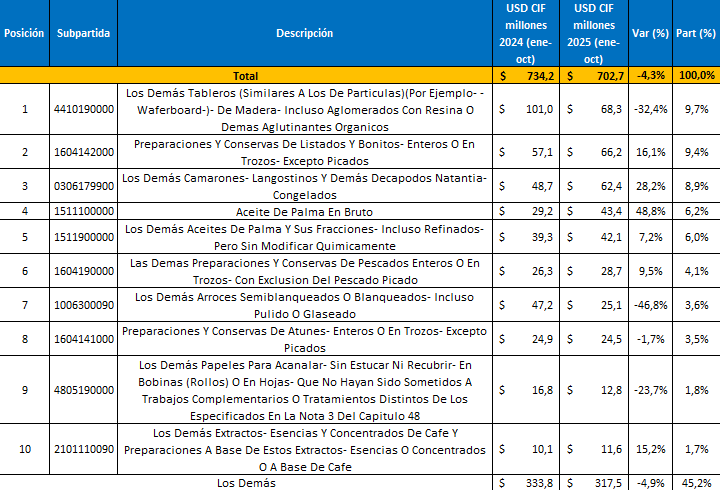 En contraste, varios bienes agroindustriales y de alimentos mostraron crecimiento y sostuvieron parte del flujo. Se destaca el aumento en preparaciones y conservas de listados y bonitos, que crecieron 16,1% hasta USD CIF $66,2 millones (9,4% del total), así como el avance de camarones y langostinos congelados con 28,2% y un valor de USD CIF $62,4 millones (8,9%). También sobresale el desempeño del aceite de palma en bruto, que aumentó 48,8% al ubicarse en USD CIF $43,4 millones (6,2%), junto con los demás aceites de palma y sus fracciones, que crecieron 7,2% y alcanzaron USD CIF $42,1 millones (6,0%)