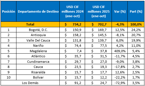 En términos de dinámica, Bogotá, D.C. creció en el periodo, al pasar de USD CIF $150,9 millones a USD CIF $169,7 millones (12,5%), aumentando su rol como principal receptor. En contraste, Antioquia retrocedió -8,9% (pasando de USD CIF $158,2 millones a USD CIF $145,5 millones), Valle del Cauca creció 6,0% (cuando en el 2024 registraba UDS CIF $131,8 millones) y Nariño creció con 4,2%.