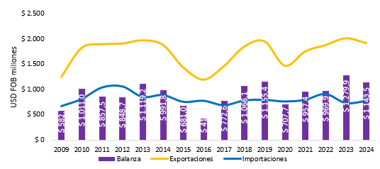 Finalmente, respecto a la balanza comercial con Ecuador, se encuentra que en el periodo analizado (2009 a 2025), la balanza siempre ha sido superavitaria para Colombia, con sus mayores picos en 2023, 2019 y 2024, con saldos positivos superiores a USD FOB $1.000 millones. Además, con corte a ene–nov, la relación comercial con Ecuador mantiene un saldo favorable para Colombia, aunque en 2025 se observa una reducción del superávit frente al año anterior. Las exportaciones pasaron de USD FOB $1.728,7 millones en 2024 a USD FOB $1.673,1 millones en 2025 (-3,2%), mientras que las importaciones aumentaron de USD FOB $711,6 millones a USD FOB $752,5 millones (5,7%). Como resultado, la balanza comercial se redujo de USD FOB $1.017,1 millones a USD FOB $920,7 millones, lo que confirma que el ajuste del saldo responde a una combinación de menor dinamismo exportador y mayores compras desde Ecuador.