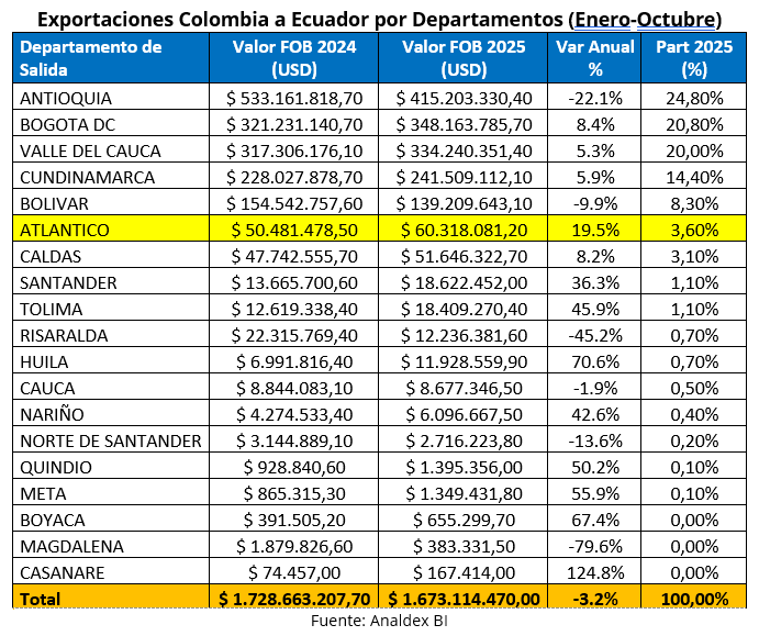 A diferencia del comportamiento general de las exportaciones colombianas hacia Ecuador, que registraron una contracción del 3,2% a nivel nacional, el departamento del Atlántico ha mostrado un dinamismo sobresaliente. Mientras que departamentos líderes como Antioquia y Bolívar sufrieron caídas de doble dígito, el Atlántico logró un incremento del 19,5% en sus ventas externas, pasando de 60,3 millones en 2025