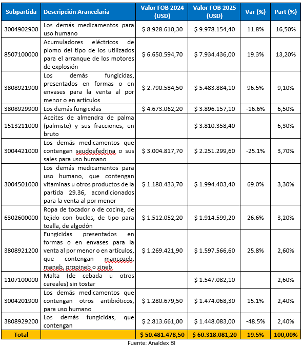 • Sector Farmacéutico: Sigue siendo el pilar. Los medicamentos para uso humano no solo son el principal rubro con $9,9 millones de dólares (+11,8%), sino que, sumados a otras subpartidas de medicamentos con vitaminas o antibióticos, consolidan una participación crítica en el mercado.
