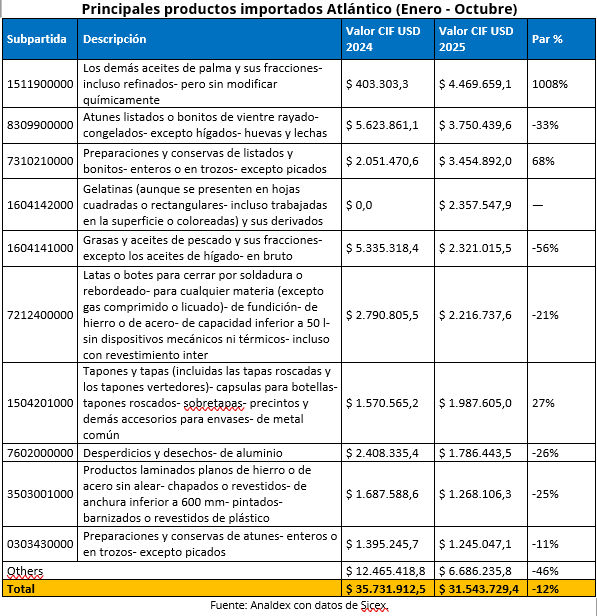 En el ecosistema de compras externas del Atlántico, que en 2025 consolidó un valor total de USD 2.729 millones, el mercado ecuatoriano ocupa actualmente la posición número 15 entre los principales socios comerciales. A pesar de que el departamento incrementó sus importaciones globales en un 3%, las adquisiciones provenientes de Ecuador experimentaron una contracción del 12%, descendiendo de USD 35,7 millones en 2024 a USD 31,5 millones en 2025. Este comportamiento sitúa a Ecuador por debajo de otros proveedores clave como Argelia, Rusia y España, evidenciando una pérdida de terreno en la balanza comercial regional.