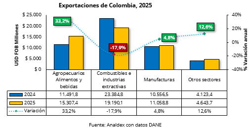 En el corrido de 2025, las exportaciones agropecuarias, alimentos y bebidas se ubicaron en USD FOB $15.307,3 millones, presentando un crecimiento de 33,2% frente al mismo periodo de 2024, cuando se alcanzaron ventas por un valor de USD FOB $11.491,8 millones.