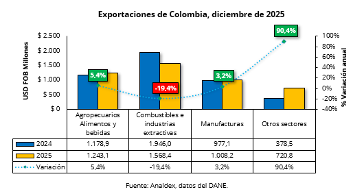 En diciembre de 2025, las ventas externas colombianas alcanzaron USD FOB $4.540,5 millones, presentando un crecimiento en su valor de 1,3% frente al nivel del mismo mes del año anterior, por su parte, el peso exportado creció un 4,7%, ubicándose en 9,4 millones de toneladas métricas, jalonado principalmente por el crecimiento de las ventas al exterior de Hulla, coque y briquetas, con ventas en diciembre de 5,8 millones de toneladas métricas, presentando un crecimiento de 9,0% respecto al mismo periodo del año anterior.