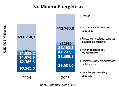 La canasta de exportación no minero-energética año corrido presentó un incremento de 20,0% contra el mismo periodo de 2024, con un total exportado de USD FOB $26.395,9 millones. Café, té, yerba mate y especias lidera este tipo de exportaciones con una participación en esta canasta de 11,9%.