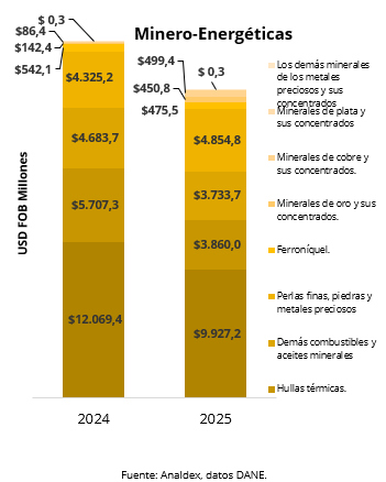 Por grupos de productos, las ventas al exterior de combustibles y productos de las industrias extractivas participaron con 34,5% y un decrecimiento del 19,4% respecto al año anterior. Por su parte, agropecuarios, alimentos y bebidas participaron con 27,4%, este tipo de productos presentó un crecimiento del 5,4% respecto a diciembre de 2024, por su parte manufacturas participó con un 22,2% con un comportamiento creciente en sus ventas del 3,2%, y otros sectores (oro no monetario) con 15,9% de participación y un crecimiento en ventas de 90,4%.