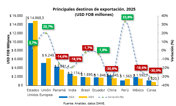 En lo corrido del año 2025, el principal destino de las ventas externas colombianas continuó siendo Estados Unidos con un crecimiento del 3,7%, al pasar de USD FOB $ 14.335,0 millones en 2024 a USD FOB $ 14.868,3 millones en 2025. Este destino representa el 29,6% de las ventas externas del país. Siendo los principales productos vendidos a este país café, flores y puertas y ventanas, representando alrededor del 57,9% de exportaciones NME a este destino.