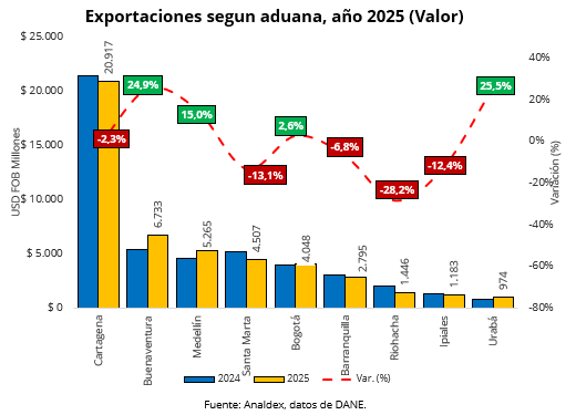 En el año 2025, Cartagena fue la principal aduana de salida de las exportaciones, al representar el 41,7% del total. Se evidenció un decrecimiento de las ventas al exterior por esta aduana de 2,3%, al pasar de USD FOB $21.408 millones a USD FOB $20.916 millones.