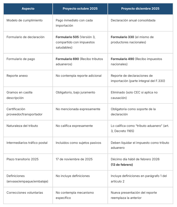 El primer proyecto sugería un pago inmediato con cada declaración de importación, integrando el recaudo al proceso de nacionalización. El segundo proyecto, más reciente, giró hacia un esquema de declaración anual consolidada, similar al de los productores nacionales.