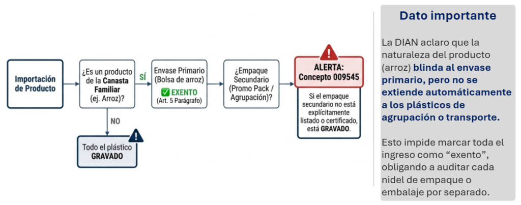 Hemos identificado un concepto técnico que denominamos la «cascada limitada», derivado de la doctrina reciente de la DIAN. Según este criterio, la exclusión tributaria del IPUSUI (por ejemplo, para alimentos de la canasta familiar) suele proteger únicamente el envase primario, es decir, la capa que está en contacto directo con el producto.