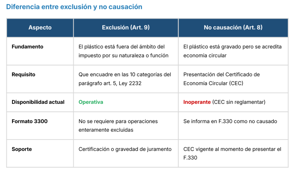 Desde el punto de vista estrictamente operativo, esto convierte la no causación en una figura inaplicable para el vencimiento actual. Todo plástico gravado (capas secundarias y terciarias, conforme a la regla de cascada limitada que explicamos previamente) debe ser liquidado y pagado, independientemente de los procesos de reciclaje o aprovechamiento que realice la compañía, al no existir el mecanismo formal para acreditar la excepción.