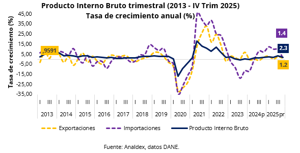 Según el DANE, el cuarto trimestre de 2025 registró un crecimiento de la economía colombiana de 2,3%, con respecto al mismo periodo de 2024. Respecto a la serie ajustada por efecto estacional y calendario, el crecimiento del cuarto trimestre de 2025 comparado con el cuarto trimestre de 2024 es de 0,1% en su serie ajustada por efecto.