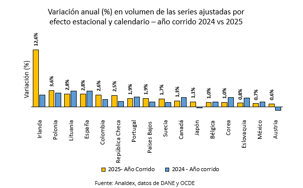 Finalmente, al comparar con algunos países de la OCDE que ya han publicado este dato del PIB corrido del año 2025, Colombia se ubica en la quinta posición con mayor crecimiento, aunque las cifras son parciales, ya que varios países aún no tienen la cifra para el total del 2025.
