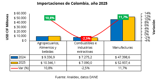 En el año 2025, las compras al exterior del grupo agropecuario, alimentos y bebidas alcanzaron la cifra de USD CIF $10.346,1 millones, presentando una variación positiva de 10,8%. Los productos con mayor contribución al alza fueron Café, té, cacao, especias y sus preparados (108,9%) y Demás agropecuarios, alimentos y bebidas (18,0%); por otra parte, se registraron detrimentos en las compras al exterior de azúcares, preparados de azúcar y miel (-29,3%).